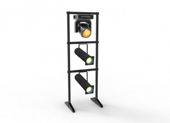 Admiral Freedom Floor Rack Set, schwarz, 100x30cm Freedom Rigging System Der Name dieses Produktes ist selbsterklärend. Admiral hat ein modulares Rigging-System entwickelt, welches so viele Möglichkeiten zum Aufhängen bietet, dass dir die Ideen vor den Optionen ausgehen. Das System kann sowohl hängend, als auch im Stehen verwendet werden und bietet somit etliche Kombinationsvarianten. Die Höhe kann durch das Ineinanderschieben von mehreren Längsprofilen verstellt werden, während die Breite durch die verschiedenen Längen der Querprofile bestimmt werden kann. Mit dem Freedom Rigging System kannst du jede Art von Scheinwerfer flexibel montieren. Floor Rack Das Freedom Floor Rack kann als Beleuchtungsturm verwendet werden, indem man den Downrigger einfach auf den Kopf stellt und in die Freedom Support Base schiebt. Du kannst es als Seitenturm, Moving Head Tower oder Floor Stand nutzen. Auch eine symmetrische oder asymmetrische Positionierung der Profile in der Basis ist möglich. Features Einfaches Erzeugen von mehreren Lichtebenen / Matrizen Bestehende Truss Aufbauten können simpel ergänzt werden Platzsparende und flexible Einsatzmöglichkeiten Optionale Safety Ösen zur Sicherung der Endgeräte Anwendungsbeispiel Das Admiral Floor Rack Set eignet sich optimal für verschiedene Einsatzszenarien in Theatern. So kann es als Fußlicht, beispielsweise bei Ballettaufführungen, oder als Gassenlicht verwendet werden. Technische Daten Material: Aluminium Farbe: Schwarz Maße(BxH): 300x1000mm Gewicht: 8,654kg