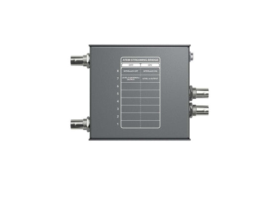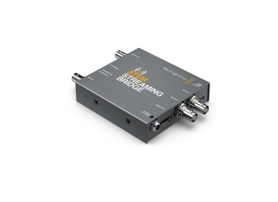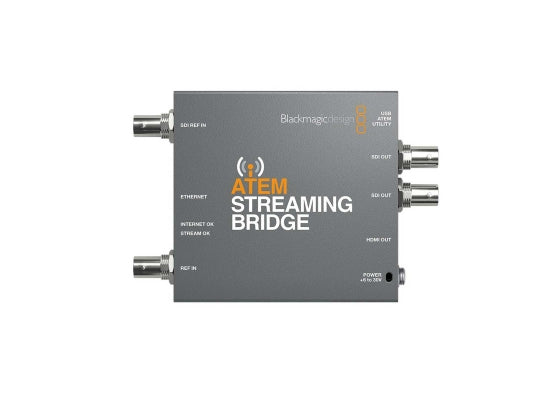 Blackmagic Design ATEM Streaming Bridge Die ATEM Streaming Bridge von Blackmagic Design ist ein Videokonverter, über den Sie einen H.264-Stream von einem beliebigen ATEM Mini Pro empfangen und in SDI- und HDMI-Video zurückwandeln können. Das gestattet es Ihnen, Video an Remote-Standorte auf Ihrem lokalen Ethernet-Netzwerk oder per Internet sogar in die ganze Welt zu übermitteln. Möglich ist das, weil der Konverter fortschrittliche H.264-Codecs für eine höhere Qualität bei äußerst geringen Datenraten einsetzt. Ein mögliches Produktionsszenario: Broadcaster und Blogger arbeiten gemeinsam an Sendungen und kreieren so globale Netzwerke aus ATEM Mini Pro Remote-Rundfunkstudios. Der Konverter lässt sich einfach einrichten. ATEM Software Utility erstellt Setup-Dateien, die Sie per E-Mail an ATEM Mini Pro Studios an anderen Standorten schicken können. Die ATEM Streaming Bridge ist ideal für den Einsatz eines ATEM Mini Pro als Remote-Rundfunkstudio. Technische Daten Anschlüsse SDI-Referenzeingänge: 1x 3G-SDI SDI-Videoausgänge: 2x 3G-SDI SDI-Audioausgänge: 2 Kanäle eingebettet in HD-SDI HDMI-Videoausgänge: HDMI-Ausgang Typ A HDMI-Audioausgänge: 2 Kanäle eingebettet in HDMI SDI-Raten: 1,5 G; 3 G Referenzeingang: Black Burst und Tri-Sync Ethernet: Ethernet unterstützt 10/100/1000 BaseT Aktualisierungen und Konfiguration: 1 USB-Port Typ C für Softwaresteuerung und Software-Updates Zoom ATEM Streaming Bridge Normen SDI-Videonormen: 1080p/23,98; 1080p/24; 1080p/25; 1080p/29,97; 1080p/30; 1080p/50; 1080p/59,94; 1080p/60; 1080i/50; 1080i/59,94; 1080i/60 HDMI-Videonormen: 1080p/23,98; 1080p/24; 1080p/25; 1080p/29,97; 1080p/30; 1080p/50; 1080p/59,94; 1080p/60 SDI-Konformität: SMPTE 259M, SMPTE 292M, SMPTE 296M, SMPTE 424M-B, SMPTE 425 Level A und Level B SDI-Videoabtastfrequenz: 4:2:2 SDI-Audioabtastfrequenz: Standard-Fernsehabtastrate von 48 kHz und 24 Bit SDI-Farbgenauigkeit: 10 Bit SDI-Farbraum: YUV Streaming Streaming-Eingabe: Die ATEM Streaming Bridge unterstützt die per Ethernet mit einem ATEM Mini Pro oder ATEM Mini Pro ISO gestreamte Videoeingabe. Software Die Produktsoftware wird über das Aktualisierungsprogramm aktualisiert. Betriebssysteme Mac Mojave 10.14, Mac Catalina 10.15 oder höher Windows 8.1 und 10, beide 64 Bit Steuerung der Einstellungen: Mini-Switches oder das Setup-Dienstprogramm über eine bestehende USB-Verbindung Strombedarf Stromversorgung: 12V-Universalnetzteil mit Steckeradaptern passend für alle Länder inbegriffen Stromverbrauch Max. 6W Stromversorgung: EMC, FCC, CE und KCC Lieferumfang ATEM Streaming Bridge 12V-Universalnetzteil mit Steckeradaptern passend für alle Länder