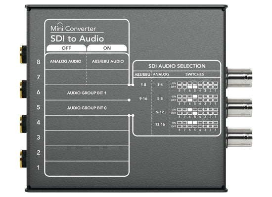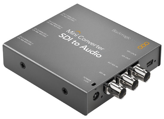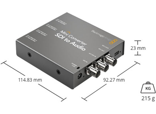 Blackmagic Design Mini Converter SDI / Audio Genau das Richtige zum Herauslösen von Audio aus beliebigen SDI-Quellen in den Formaten SD und HD bis zu 1080p/60! Audiosignale werden via ¼-Zoll-Anschlüsse als symmetrisches Analogaudio bzw. AES/EBU-Audio an Geräte wie Mischer, analoge MAZen, Audiomonitoren usw. ausgegeben. Ein Mini Converter SDI to Audio bietet sich zum Herauslösen von Audio aus SD/HD-SDI-Signalen an, wo kein Ultra-HD-Modell von Nöten ist und Sie Kosten senken möchten. Technische Daten SDI-Videoeingang: Umschaltbar zwischen SD, HD und 3G-SDI SDI-Videoausgang: Automatische Anpassung der SD-, HD- und 3G-SDI-Videoeingabe Analog-Audio: 4 Kanäle professionelles symmetrisches Analog-Audio via reguläre 1/4-Zoll-Klinkenbuchsen AES/EBU-Digital-Audio: 8 Kanäle professionelles symmetrisches Digital-Audio via reguläre 1/4-Zoll-Klinkenbuchsen Redundanter SDI-Eingang: Automatische Umschaltung bei Ausfall des Haupt-SDI-Eingangs Multi-Rate-Unterstützung: Automatische Erkennung von SD, HD, 2K und 3G-SDI Aktualisierungen und Konfiguration: Via Hochgeschwindigkeits-USB 2.0 (480 Mb/s) Neutaktung: Ja Netzteil: +12 V Universal-Netzteil mit Steckeradaptern passend für alle Länder inbegriffen. Kabelbinderpunkt Strombedarf: 5,52 Watt Betriebsspannungsbereich: 12 - 31 V DC Maße (BxTxH): 114.83x92.27x23mm Gewicht: 0.215kg Lieferumfang Mini Converter SDI to Audio 12 V Universal-Netzteil mit Steckeradaptern passend für alle Länder