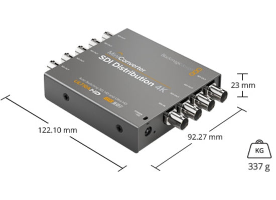 Blackmagic Design Mini Converter SDI Distribution 4K 1 auf 8 DA für SD-SDI bis UltraHD-SDISchließen Sie eine einzige SDI-Quelle an acht neugetaktete SDI-Ausgänge an, die automatisch zwischenallen SD-SDI-, HD-SDI-, 3G-SDI- und 6G-SDI-Videoformaten und digitalen Videosignalen miteingebetteten ASI-, Zusatz- und Audiodaten umschalten. Technische Daten Anschlüsse SDI-Videoeingang: Umschaltbar zwischen SD, HD und 6G-SDISDI SDI-Videoausgang: 8 Ausgänge, die sich automatisch an die SDI-Videoeingabe anpassen Multi-Rate-Unterstützung: Automatische Erkennung von SD, HD und 6G-SDI Reclocking: Ja Normen SD-Format-Unterstützung: 525/23,98 NTSC; 525/29,97 NTSC. 625/25 PAL HD-Format-Unterstützung: 720p/50; 720p/59,94; 720p/60; 1080i/50; 1080i/59,94; 1080i/60; 1080p/23,98; 1080PsF,23,98; 1080p/24; 1080PsF/24; 1080p/25; 1080PsF/25; 1080p/29,97; 1080PsF/29,97; 1080p/30; 1080PsF/30; 1080p/50; 1080p/59,94; 1080p/60 2K-Format-Unterstützung: 2048 x 1080PsF/23,98; 2048 x 1080p/23,98; 2048 x 1080PsF/24; 2048 x 1080p/24; 2048 x 1080PsF/25; 2048 x 1080p/25 4K-Format-Unterstützung: 3840 x 2160p/23,98; 3840 x 2160p/24; 3840 x 2160p/25; 3840 x 2160p/29,97; 3840 x 2160p/30; 4096 x 2160p/24 SDI-Konformität: SMPTE 259M; SMPTE 292M; SMPTE 296M; SMPTE 372M; SMPTE 424M-B; SMPTE 425M; SMPTE ST-2081 SDI-Videoraten: SDI-Videoanschlüsse sind zwischen SD, HD, Ultra HD und DCI 4K umschaltbar. SDI-Videoabtastfrequenz: 4:2:2 und 4:4:4 SDI-Audioabtastfrequenz: Standard-Fernsehabtastrate von 48 kHz und 24 bit. SDI-Farbgenauigkeit: 10-Bit SDI-Farbraum: YUV und RGB Automatische SDI-Umschaltung: Automatische Erkennung von SD, HD und 6G-SDI. ASI-Unterstützung: Ja Betriebssysteme Mac: Mac OS X 10.9 Mavericks, Mac OS X 10.10 Yosemite oder höher. Windows: Windows 7 oder Windows 8 Strombedarf Netzteil: +12V Universal-Netzteil mit Steckeradaptern passend für alle Länder. Kabelbinderpunkt. Strombedarf: 4,80 Watt Betriebsspannungsbereich: 12 - 31 V DC Umgebungsbedingungen Betriebstemperatur: 0° bis 40° C Lagertemperatur: -20° bis 45° C Relative Luftfeuchtigkeit: 0 % bis 90 % nicht-kondensierend Maße/Gewicht Maße: 122 x 92.27 x 23 mm Gewicht: 0,24 kg Lieferumfang Mini Converter SDI Distribution 4K Software Download Link 12V Universal-Netzteil mit Steckeradaptern passend für alle Länder