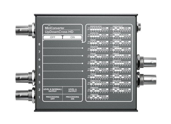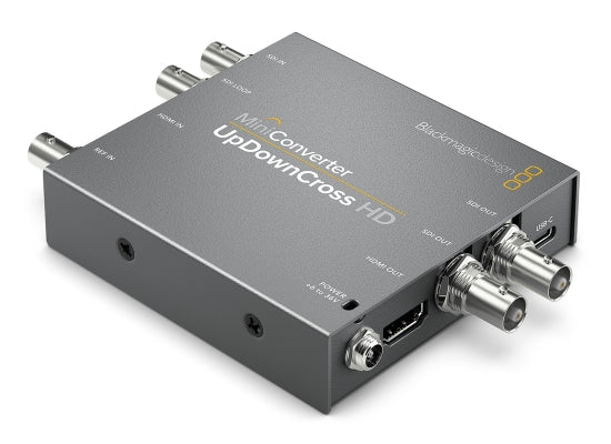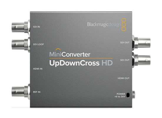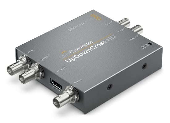 Blackmagic Design Mini Converter UpDownCross HD Der Mini Converter UpDownCross HD ist ein vollwertiger Normwandler, der jedes beliebige SD- oder HD-Videoformat in ein beliebiges anderes SD- oder HD-Videoformat konvertiert. Geboten werden sowohl SDI- als auch HDMI-Eingänge und -Ausgänge komplett mit einem Referenzeingang für den integrierten Resynchronisierer, hochwertige Teranex Algorithmen für die Konvertierung, automatische Audioverzögerung für perfekte AV-Synchronisierung, ein internationales Netzteil und mehr. Technische Daten Anschlüsse SDI-Videoeingänge: 1 Anschluss für SD-, HD- oder 3G-SDI-Video und 1 externer Referenzeingang HDMI-Videoeingänge: HDMI-Eingang Typ A SDI-Videoausgänge: 2 SDI-Ausgänge ; 1 SDI-Ausgang mit Durchschleifung HDMI-Videoausgänge: HDMI-Ausgang Typ A; Ausgang unterstützt die EDID-Daten des Monitors SDI-Raten: 270 Mbit; 1,5 G; 3 G Referenzeingänge: Black Burst und Tri-Sync für SD und HD Multirate-Unterstützung: Automatische Erkennung eingehender SDI-Signale in HD oder Standard Definition Aktualisierungen und Konfiguration: USB Reclocking: Ja Normen SD-Videonormen: 525i/59,94 NTSC; 625i/50 PAL HD-Videonormen: 720p/50; 720p/59,94; 720p/60 , 1080p/23,98; 1080p/24; 1080p/25; 1080p/29,97; 1080p/30; 1080p/50; 1080p/59,94; 1080p/60, 1080PsF/23,98; 1080PsF/24, 1080i/50; 1080i/59,94; 1080i/60 Videonormen für HDMI-Eingaben: 525i/59,94; 625i/50; 720p/50; 720p/59,94; 720p/60, 1080p/23,98; 1080p/24; 1080p/25; 1080p/29,97; 1080p/30; 1080p/50; 1080p/59,94; 1080p/60, 1080i/50; 1080i/59,94; 1080i/60 SDI-Konformität: SMPTE 259M, SMPTE 292M, SMPTE 296M, SMPTE 424M, SMPTE 425M Level A oder Level B , ITU-R BT.601, ITU-R BT.656 SDI-Videoraten: SDI-Videoanschlüsse sind zwischen Standard Definition und High Definition umschaltbar SDI-Videoabtastfrequenz: 4:2:2 SDI-Audioabtastfrequenz: Standard-Fernsehabtastrate von 48 kHz und 24 Bit SDI-Farbgenauigkeit: 4:2:2 SDI-Farbraum: YUV Automatische SDI-Umschaltung: Automatische Erkennung von SD, HD und 3G-SDI Formatwandlung Videokonvertierung: Konvertiert beliebige SD- und HD-Eingaben nach 525i/59,94; 625i/50; 720p/50; 720p/59,94; 720p/60 , 1080p/23,98; 1080p/24; 1080p/25; 1080p/29,97; 1080p/30; 1080p/50; 1080p/59,94; 1080p/60 , 1080i/50; 1080i/59,94; 1080i/60 Computerskalierung: Skaliert die DVI-Auflösungen 640x480, 800x600, 1024x768 nach 525i/59,94; 625i/50; 720p/50; 720p/59,94; 720p/60, 1080p/23,98; 1080p/24; 1080p/25; 1080p/29,97; 1080p/30; 1080p/50; 1080p/59,94; 1080p/60 , 1080i/50; 1080i/59,94; 1080i/60 Strombedarf Stromversorgung: 12V-Universalnetzteil mit Steckeradaptern passend für alle Länder inbegriffen Stromverbrauch: 5 Watt Betriebsspannungsbereich: 6–36 V DC Umgebung Betriebstemperatur: 0–40 °C Lagerungstemperatur: -20–45 °C Relative Luftfeuchtigkeit: 0–90 % nicht kondensierend Physische Spezifikationen Maße (BxTxH): 135x92x24mm Gewicht: 0,247kg Lieferumfang Mini Converter UpDownCross HD 12V-Universalnetzteil mit Steckeradaptern passend für alle Länder