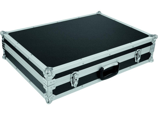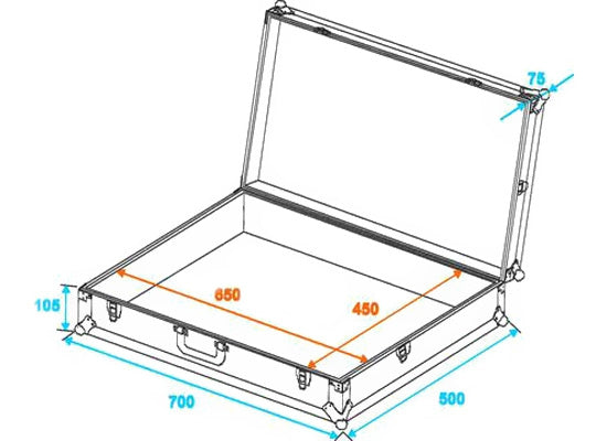 Case Universal, Kofferausführung Features Schaumstoffgepolsterter Innenraum (schwarz) Schaumstoffgepolsterter Deckel (nicht abnehmbar) Schaumeinlage kann jeder Geräteform angepasst werden Hochwertige Verarbeitung mit 7 mm mehrschichtig verleimtem Holz, schwarz laminiert Aluminiumprofilrahmen (22 mm) mit abgerundeten Ecken Dreischenklige, mittelgroße Stahlkugelecken 2x abschließbare Schnappschlösser, 2x Schlüssel beiliegend 1x Robuster Klappgriff Technische Daten Maximalbelastung: 20 kg Wandstärke: 7 mm Außenmaße (BxTxH): 700x500x170mm Innenmaße (BxTxH): 650x450x105mm Gewicht: 8kg