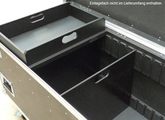 Universalcase Truck Flex 80 RoadLine Serie Für extreme Anforderungen 33mm - Kantenschutz mit Nietrille Große Beschläge 9,5 mm Multiplexholz Features PVC-schwarz 8 Klappgriffe 2 Butterfly-Verschlüsse 4 Rollen (2 gebremst): Ø100mm, schwarz Trennwände können im Abstand von 6cm eingeschoben werden. Technische Daten 2 Trennwände (hoch) - 560x535x9,5mm Außenmaß (LxTxH): 80x60x60cm Nutzbarer Raum innen (LxTxH): : 76x57x57cm Gewicht: 33kg