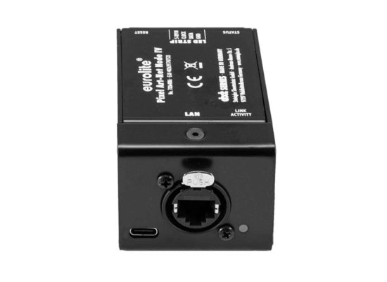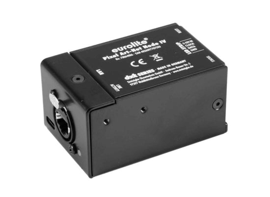 Eurolite DXT Pixel Art-Net Node IV Features Art-Net-Interface zur Ansteuerung von 50000 digitalen LED-Kanälen Kann bis zu 2048 DMX-Kanäle empfangen und verarbeiten 1 bis 6 Farben pro Pixel Erstellen von Pixel-Gruppen (1 - 9999) Ansteuerbar über ArtNet; sACN Konfiguration über Website oder Art-Net Geeignet für WS2801; WS2811, WS2812, SK6812; APA102 LED´s Benötigt kein separates Netzteil - Spannungsversorgung über LED-Streifen (5-12 V) Stabiles Metallgehäuse Tischpultgehäuse Made in Germany Das Gerät lässt sich über RJ-45 etherCON (W) Einbauversion mit dem PC verbinden, In Verbindung mit z.B. FreeStyler, DMXControl 3, PC_DIMMER, Lightkey (MAC) NEUTRIK Steckverbindung verbaut Technische Daten Stromversorgung: 5-12 V DC Pinbelegung: Pin1 (GND) / Pin2 (DATA) / Pin3 (CLOCK) / Pin4 (VIN) Gesamtanschlusswert: 1 W Schutzart: IP20 Stromanschluss: Stromeinspeisung über 4-pol Schraubsteckverbinder (M) Einbauversion DMX-Kanäle: Eingang 2048 Netzwerkanschluss: Protokoll: Ethernet TCP/IP über 1x RJ-45 etherCON (W) Einbauversion, 10 Mbit/s Standard: IEEE 802.3u Ansteuerung: ArtNet; sACN Steuerkanäle: 50000 Gehäusefarbe: Schwarz Status LED: Signal, Link Anschlüsse: Eingang: 1 x RJ-45 etherCON (W) Einbauversion Ausgang: Schraubsteckklemme Markenverwendung: NEUTRIK Steckverbindung verbaut PC connect: Z.B. FreeStyler, DMXControl 3, PC_DIMMER, Lightkey (MAC) über RJ-45 etherCON (W) Einbauversion Gehäusebauform: Tischpultgehäuse Maße (BxTxH): 78x50x42mm Gewicht: 0,25kg