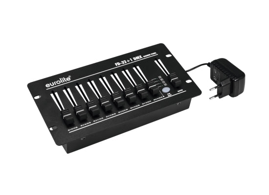Eurolite FD-32+1 DMX Dimmer Panel Features Einfacher DMX-Controller zur bequemen Ansteuerung von Lichteffektgeräten mit DMX512-Schnittstelle (z. B. Scheinwerfer und Dimmer) Einfach anschließen und bedienen ohne aufwendige Programmierung 8 Kanalfader zur Einstellung des DMX-Werts in 4 Gruppen 1 Masterfader Kompaktes Design 3-poliger XLR-Anschluss Spannungsversorgung über mitgeliefertes Netzteil oder 9-V-Block (nicht inkl.) Technische Daten Spannungsversorgung: 100-240 V AC, 50/60 Hz über mitgeliefertes Netzteil Batteriebetrieb: 9-V-Block Anzahl Steuerkanäle: 32 DMX512-Ausgang: 3-pol XLR-Einbaukupplung Anzahl DMX-Kanäle: 32 Gesamtanschlusswert: 7,2 W Schutzart: IP20 Farbe: Schwarz Maße (BxTxH): 120x230x65mm Gewicht: 1,0kg