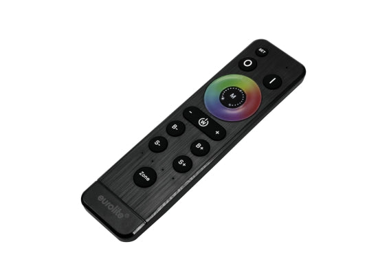 Eurolite LED Pixel Stripe Zone Fernbedienung Features Steuert mehrfarbige (CCT, RGB, RGBW, RGB+CCT) und einfarbige LED-Streifen ganz nach Wunsch 4 Zonen steuerbar Mehrere Fernbedienungen in einer Zone möglich Sendefrequenz 2,4 GHz Getrennte Steuerung für farbige und weiße Kanäle Farbauswahl über berührungsempfindliches Farbrad Ablaufgeschwindigkeit und Helligkeit einstellbar Memory-Funktion speichert die letzte Einstellung beim Ausschalten Lieferung mit Wandhalterung und Befestigungsmaterial 8 integrierte Showprogramme Hat eine Reichweite von bis zu 20m Technische Daten Batterie: 2 x 1,5V AAA Micro LR03 Alkali-Mangan (mitgeliefert) Gehäusefarbe: Schwarz Trägerfrequenz: 2,4 GHz Reichweite: 20 m Maße (BxTxH): 40x150x20mm Gewicht: 0,10 kg