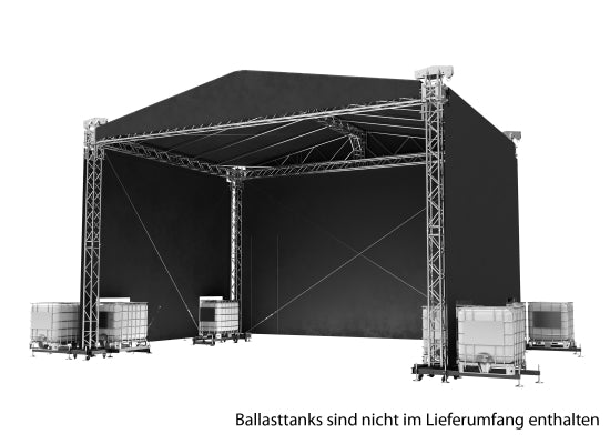 Global Truss Double Pitch Roof 8x6m Giebeldach Die Global Truss Bühnendächer überzeugen durch ihre Flexibilität und einfache Handhabung beim Aufbau der Konstruktion. Wenige Sonderteile, gleiche Teile bei verschiedenen Baugrößen und größtmögliche Belastung zeichnen die Überdachungen aus. Das Einsatzgebiet reicht von Firmenfeiern, Straßenfesten bis hin zu großen Open-Air Veranstaltungen. Bei dem Double Pitch Roof 8x6 handelt es sich um ein Giebeldach mit den Außenmaßen 9,30 x 6,8 x 6,6 Metern, die ideale Überdachung einer Podestfläche von 8x6m. Das Bühnendach basiert auf dem Multi-Tower-Basement und wird mit F34P Traversen realisiert. Die Aussteifung erfolgt über Drahtseile und speziellen Eckaussteifungen. Der Aufbau kann mit Elektrokettenzügen, sowie Handkettenzügen erfolgen. Die Sleeveblöcke können über spezielle Rahmen am Tower gesichert werden. Im Lieferumfang befinden sich eine schwarze Dachplane und schwarze Netze zur seitlichen Verkleidung, sowie ein Standsicherheitsnachweis. Nicht im Lieferumfang enthalten: Ballast und Hebezeuge. Features Giebeldach für Podestfläche 8x6m inkl. Standsicherheitsnachweis Technische Daten Traversensystem: F34P Maximale Dachlast: bis zu 1,5 t Maße (BxTxH): 9,3x6,8x6,6m