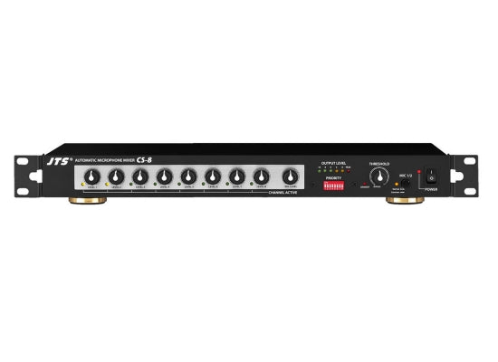 JTS CS-8 Mikrofonmixer Die automatischen Mikrofonmixer der CS-Serie sind DAS Hilfsmittel für Multi-Mikrofon-Konzepte wie sie z. B. in Konferenz- bzw. Sitzungssälen, Kirchen oder Sprachlabors vorherrschen. Die Hauptaufgabe dieser Mixer besteht darin, immer dann Mikrofone zu öffnen, wenn sie auch benötigt werden und sie wieder zuzufahren, wenn der Sprecher seinen Vortrag beendet hat. Diese intelligente Regelung der einzelnen Mikrofonkanäle geschieht dabei völlig geräuschlos und so präzise, dass keine Silbe des Redners verschluckt wird. Die positiven Auswirkungen auf den Gesamtsound sind gravierend: Rückkopplungen und störende Hintergrundgeräusche werden minimiert, der Sound gewinnt an Klarheit und Transparenz. Um ein Aufrechterhalten der Raumatmosphäre zu gewährleisten und den Klangeindruck nicht plötzlich wie abgeschnitten erscheinen zu lassen, sind die CS-Mixer mit einer Last-In-Funktion ausgestattet - ein leichter Ambient-Sound bleibt auch in Gesprächspausen erhalten. Features 8 Kanäle 3 Betriebsarten: Automodus, Priorität oder 8/1-Kanal-Mixer Symmetrische XLR- Eingänge, umschaltbar Mic/Line Zusätzlicher Stereo-Cinch-Eingang 48-V-Phantomspannung Mix-Ausgang, umschaltbar Mic/LineTriggerausgänge für externe Geräte wie z. B. Warnanzeigen, Kameras oder Lautsprecher Status-LEDs Mehrere Geräte über Link-Anschlüsse (Kabel im Lieferumfang) Desktop-Metallgehäuse 482-mm-Rackeinbau (19") mit beiliegenden Montagewinkeln Technische Daten Mic-Eingang: 0,2 mV/4,7 kΩ Line-Eingang: 60 mV/20 kΩ Line-Ausgang: 1 V/200 Ω Frequenzbereich: 35-20000 Hz Klirrfaktor: < 0,06 % Störabstand: > 70 dB Phantomspeisung: +48 V Stromversorgung: über beil. Steckernetzteil Zul. Einsatztemperatur: 0-40 °C Maße: 420x44x199mm Gewicht: 2,3 kg