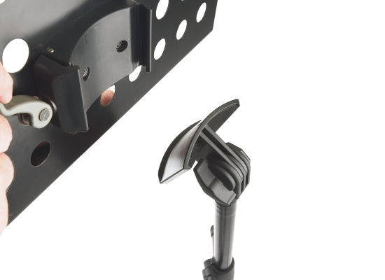 K&M 11940 Orchesternotenpult mit Lochplatte Pulverbeschichtetes gelochtes Notenpult aus Stahl mit Verbindungselementen aus Kunststoff. Die Notenpultplatte kann mit einem praktischen und bedienerfreundlichen Schnellverschluss einfach und schnell montiert und abgenommen werden. Eine große handliche Flügelmutter erleichtert das Fixieren der Schrägstellung. Die stufenlose Höhenverstellung erfolgt über eine oberflächenschonende Spannhülse. Technische Daten Ausführung: schwarz Besonderheit: bedienerfreundlicher Schnellverschluss Fußkonstruktion: Fußrohre mit Stützstreben Material: Stahl Produktkategorie: Topline Rohrkombination: 1-fach ausziehbar Verbindung Stativ/Platte: Schnellverschluss Notenauflage: 490 x 340 mm Höhe: von 740 bis 1.270 mm Gewicht: 3,6 kg