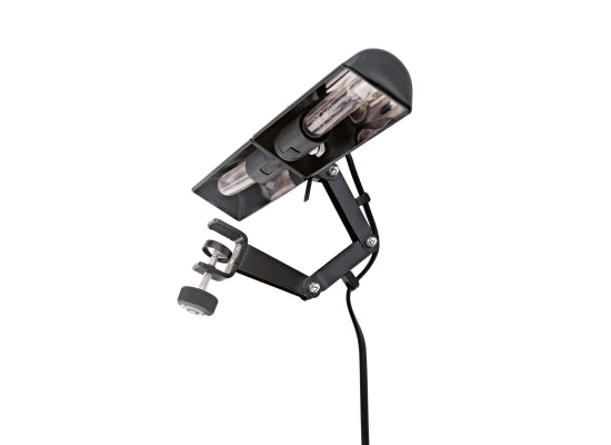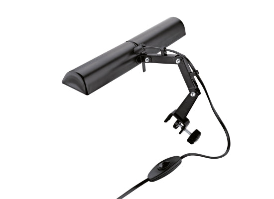 K&M 122/6 Notenpult-Doppelleuchte, schwarz Technische Daten Anschluss: 2m Stromkabel Ausführung: schwarz Helligkeit: 2x 2500 Lux Klemmbereich: bis 20mm Leistung: max. 25 Watt Leuchtmittel: 2x Röhrenleuchten Länge Lampenschirm: 320mm Material: Stahl Stromversorgung: nur Netzbetrieb Verstellung: Kippgelenk Gewicht: 0,473kg