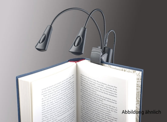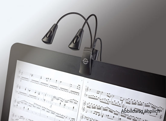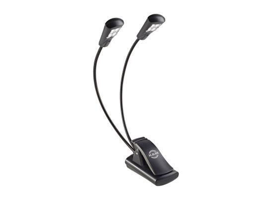 K&M 12245 Double4 FlexLight LED Notenpultleuchte, schwarz Die leistungsstarke und vielseitige LED-Leuchte bietet Komfort und Flexibilität. Durch die beiden äußerst beweglichen Schwanenhälse kann der Musiker je nach Wunsch sehr fokussiertes oder auch flächiges Licht einstellen. Jeder Kopf enthält einen Viererpack LEDs, die unabhängig voneinander in 2 Helligkeitsstufen geschaltet werden. Die neueste LED Technologie garantiert eine helle Lichtquelle bei langer Lebensdauer (100.000 Std.) und minimalem Energieverbrauch. Ein praktischer Clip ermöglicht die komfortable Montage an Platten bis zu einer Stärke von 25 mm. Die kompakte Leuchte kann wahlweise mit Batterie oder Netzteil betrieben werden und bietet somit jede Menge individuelle Einsatzmöglichkeiten. Die Batterien, 3x (1,5V AAA), sowie ein 5 V Netzteil mit 3 m Kabel, sind bereits im Lieferumfang enthalten. Technische Daten Länge Stromkabel: 3m Helligkeitsstufen: 2 Helligkeit: 2x ~1700 Lux Klemmbereich: 25mm Stromversorgung: Batteriebetrieb 3x Micro (AAA) 1,5V oder Netzbetrieb mit Netzteil Elektr. Anschlussdaten: 110V-240V, 50-60Hz Gewicht: 0,2kg