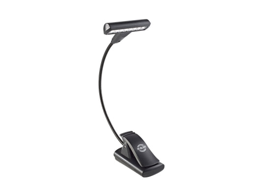 K&M 12247 T-Model FlexLight LED Notenpultleuchte, schwarz Die leistungsstarke T-Model LED-Leuchte bietet optimales Licht durch ihre 8 superhellen LEDs. Die Helligkeit ist in 2 Stufen schaltbar. Extrem lange Lebensdauer der energieeffizienten LEDs von bis zu 100.000 Stunden. Der Lichtkegel ist durch den flexiblen Schwanenhals variabel einstellbar. Mit Clip (bis 25 mm) zum Befestigen an Notenpulten, Tischplatten etc., auch als Standleuchte verwendbar. Sehr kompakt und handlich. Im Lieferumfang enthalten sind 3 Batterien (1,5 V AAA) mit einer Leuchtdauer bis zu 10 Stunden sowie einer praktischen Tragetasche. Der Betrieb über ein externes Netzteil ist ebenfalls möglich. Techinsche Daten Helligkeitsstufen: 2 Helligkeit: ~4200 Lux Klemmbereich: 25mm Länge Lampenschirm: 60,5mm Stromversorgung: Batteriebetrieb 3x Micro (AAA) 1,5V oder Netzbetrieb mit Netzteil Gewicht: 1,2kg