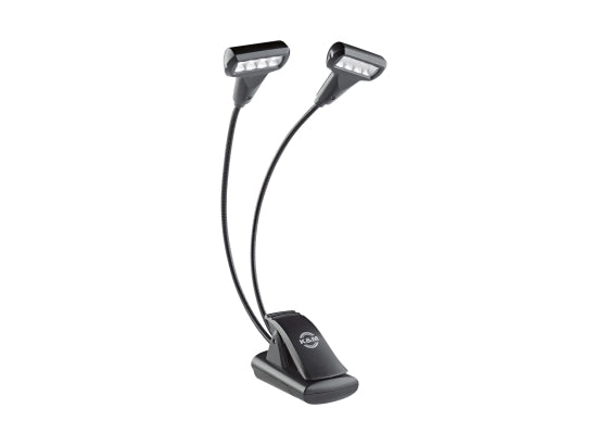 K&M 12273 Double4 LED T-Model Flexlight Notenpultleuchte, schwarz Die leistungsstarke und vielseitige LED-Leuchte bietet Komfort und Flexibilität. Durch die beiden äußerst beweglichen Schwanenhälse kann der Musiker je nach Wunsch sehr fokussiertes oder auch flächiges Licht einstellen. Das angenehm warmweiße Licht entspricht einer Farbtemperatur von 3000 Kelvin. Jeder Kopf enthält 4 LEDs, die unabhängig voneinander in 2 Helligkeitsstufen geschaltet werden. Die neueste LED Technologie garantiert eine helle Lichtquelle bei langer Lebensdauer (100.000 Std.) und minimalem Energieverbrauch. Ein praktischer Clip ermöglicht die komfortable Montage an Platten bis zu einer Stärke von 25 mm. Im Lieferumfang enthalten sind 3 Batterien (1,5 V AAA) mit einer Leuchtdauer bis zu 10 Stunden. Der Betrieb über ein externes Netzteil ist ebenfalls möglich (nicht im Lieferumfang enthalten). Technische Daten Ausführung: schwarz Leuchtmittel: 2x 4 LEDs Helligkeit: 2 Helligkeitsstufen schaltbar Farbtemperatur: 3000K Lichtstrom: 64 Lumen Material: Kunststoff Stromversorgung: Batteriebetrieb 3x Micro (AAA); 1,5V oder Netzbetrieb mit Netzteil Besonderheit: inkl. Batterien Verstellung: Schwanenhals Klemmbereich: bis 25mm Gewicht: 0,1 kg