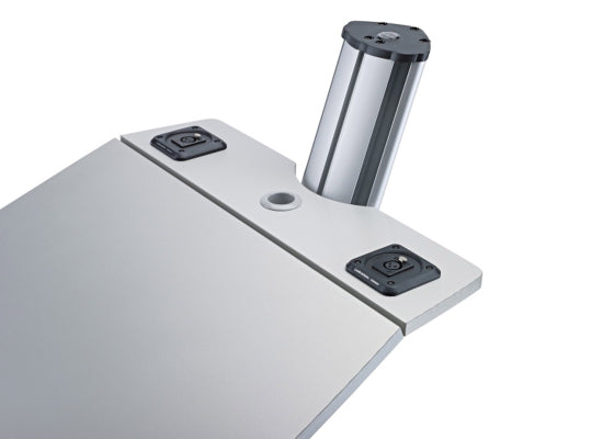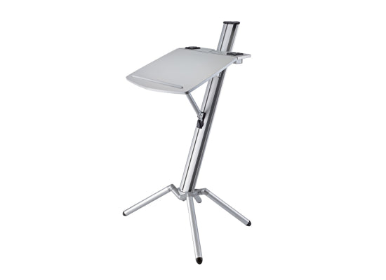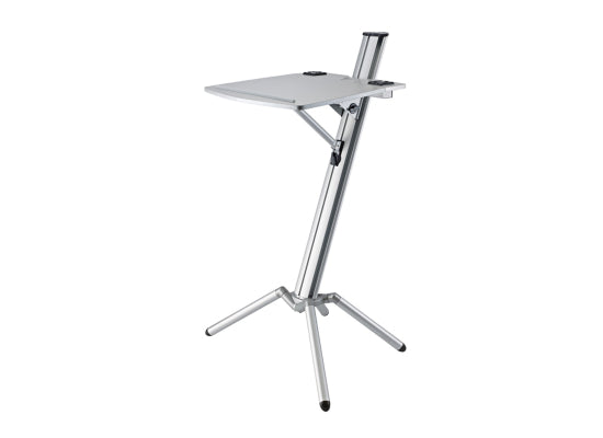 K&M 12386 Ovation Pro Rednerpult Stabile, schräg gestellte Aluprofilsäule mit erhöhten Füßen (für große Beinfreiheit). Elegante Manuskriptablage mit geprägter Aluminiumoberfläche und Anschlagleiste, Höhe und Neigung stufenlos einstellbar. Durchführungsbuchse in der Ablage und Kabelclipse für elegante Kabelverlegung. Zwei 3-polige XLR-Mikrofonanschlüsse, akustisch entkoppelt zur Aufnahme von Schwanenhals- oder anderen leichten Mikrofonen mit XLR-Steckern. Technische Daten Anschluss: zwei 3-polige XLR-Mikrofonanschlüsse Besonderheit: akustisch entkoppelt (wirkungsvolle Reduktion von Erschütterungen und Vibrationen) Material: Stativ Aluminium, aluminiumüberzogene Holzplatte Manuskriptplatte: 620x462mm Maße (BxTxH): 810x700x1340mm Gewicht: 17kg