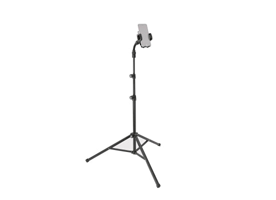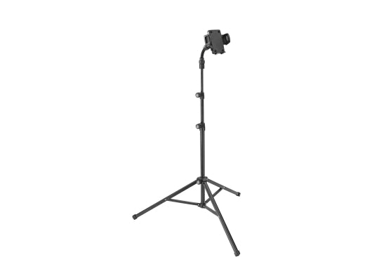 K&M 19749 Smartphone-Stativ Mit diesem universellen Smartphone Stativ ist Ihr Smartphone immer in Reichweite. In der Höhe deckt das Stativ einen Einsatzbereich von 600 bis 1400 mm ab. Geeignet ist die Halterung für alle flachen Geräte mit einer Breite von 60 bis 84 mm. Die Bedienung ist einfach und schnell. Smartphone einlegen - Klemmbacken zusammen drücken - fertig. Auf Knopfdruck wird das Gerät wieder freigegeben. Die Klemmbacken mit integrierter Gummiauflage garantieren einen sicheren Halt. Die austauschbaren Stützstege mit unterschiedlicher Tiefe können individuell dem Smartphone angepasst werden, sodass die Funktion der Bedienungselemente am Gerät nicht beeinträchtigt wird. Dank dem flexiblen Kugelgelenk kann der Halter nach oben und unten geneigt, und um 360° gedreht werden. Der flexible Haltearm mit einer Länge von 100 mm sorgt für zusätzliche individuelle Positionierung. Technische Daten Aufstellmaß ø: 700 mm Ausführung: schwarz Besonderheit: besonders geeignet für Smartphones, flache Geräte und MP3 Player; Bedienungselemente werden in der Funktion nicht beeinträchtigt; drehbar um 360°; Flexibler Haltearm für individuelle Ausrichtung Fußkonstruktion: Profilfüße mit Stützstreben Material: Kunststoff, Stahl Rohrkombination: 2-fach ausziehbar Maße(BxH): 60-84x600-1400mm Gewicht: 1,1kg