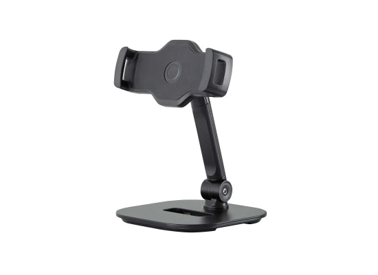 K&M 19800 Tablet-PC Tischstativ Stylisch und funktionell präsentiert sich das Tischstativ für Smartphones und Tablets. Der Halter kann Geräte mit einer Größe von 10,2 bis 13“ aufnehmen. Das entspricht einer Klemmbreite von 130 bis 224 mm. Die Klammern und die Anlagefläche sind mit rutschfestem Gummi überzogen und sorgen somit für zusätzliche Sicherheit und einen schonenden Grip. Die Halterung lässt sich über einen Kugelkopf individuell und stufenlos einstellen. Der Auslegerarm kann um 360° gedreht werden und ist in der Neigung von 0 bis 150° stufenlos einstellbar. Die robuste Fußkonstruktion besteht aus einer Metallplatte und einem Unterbau mit 4 rutschfesten Füßen. Die Unterkonstruktion hält zudem einen Inbusschlüssel bereit und ermöglicht eine komfortable Kabeldurchführung. Features Drehbar um 360° Technische Daten Ausführung: schwarz Breite: von 130 bis 224 mm Material: Kunststoff, Stahl Neigung: 0° bis 150° Schwenkbereich: 360 ° Verstellung: stufenlos Gewicht: 0,98kg