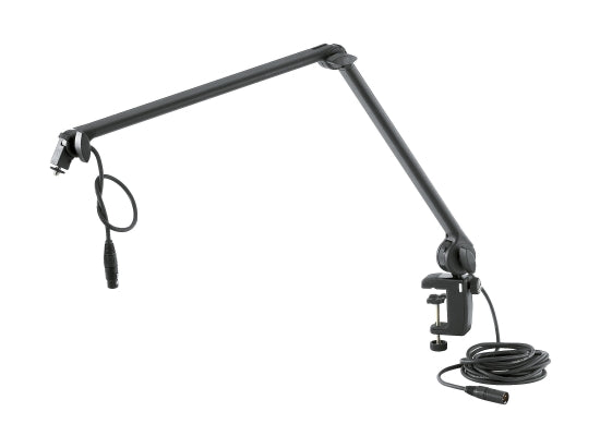 K&M 23860 Mikrofonarm, schwarz, 3/8, , / 5/8, , Dieser exklusive Mikrofonarm mit 3/8" bzw. 5/8" Gewindeanschluss in modernem Design mit neuer innovativer Tischklammer ermöglicht das schnelle und flexible Ausrichten von Mikrofonen in Studios oder an multimedialen Arbeitsplätzen. Das innengeführte Mikrokabel, mit 3 poliger XLR Steckverbindung, hat eine Gesamtlänge von 6 m. Mikrofone mit einem Gewicht von bis zu 1,5 kg werden problemlos in jeder beliebigen Stellung gehalten. Mit einem Klemmbereich von 0 bis 48 mm bietet die Klammer ein breites Spektrum an Befestigungsmöglichkeiten. Das stabile Metallgerüst mit hochwertigen Kunststoffeinsätzen und rutschhemmender Auflage gewährleistet eine sichere und kraftvolle Klemmung. Dank der speziell geformten Klemmflächen kann die Klammer bei glatten Flächen genauso wie bei runden Rohren eingesetzt werden. Technische Daten Anschluss: 3-poliges XLR-Kabel 6 m Gewindeanschluss: 3/8" und 5/8" Klemmbereich: bis 48 mm Max. Tragkraft: 1,5kg Material: Aluminium, Stahl Ausführung: schwarz Länge: von 460 bis 960 mm Gewicht: 1,3 kg