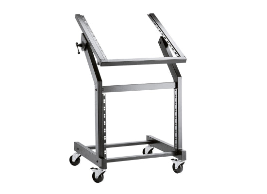 K&M 42020 Rack Wagen 19"-Rack-Einheit für insgesamt 21 HE (davon 12 HE oben). Massive vibrationsfreie Stahlrohrkonstruktion, fahrbar durch 4 Lenkrollen, davon 2 feststellbar. 19"-Lochschienen inkl. Käfigmuttern und Befestigungsschrauben (32 Stück). Oberteil bis 45° schwenkbar, arretierbar mittels Spindel. Der Ständer kann für den Transport zerlegt werden. Technische Daten Material: Stahl Verstellung: Knebel max. Belastbarkeit: 50kg Höhe (HE): Aufnahmerahmen 12HE, Grundgestell 9 HE Besonderheiten: 4 Lenkrollen, 2 feststellbar; inklusive Käfigmuttern M5 und Befestigungsschrauben M5 x 16 (32 Stück); Oberteil bis 45° schwenkbar; sehr stabil Höhe: 910mm Gewicht: 12,88kg