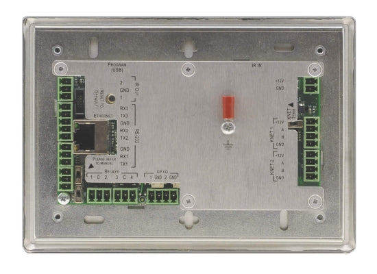 Kramer RC-74DL/B Medien-Raumsteuerung, schwarz RC−74DL ist eine 12−Tasten Master−Raumsteuerung mit einem digitalen Lautstärkeknopf für Multimedia−Räume. Das Gerät kann entweder als separate Steuerung eingesetzt werden oder über Ethernet mit Kramers Site−CTRL™ als Teil eines größeren Raumsteuersystems mit Audio− und Videokomponenten sowie anderen Raumeinrichtungen wie Licht, Vorhänge und Bildwände. Features mit fast allen Kramer Geräten mit RS-232 Anschluss kompatibel 12x Hinterleuchtete und etikettierbare Tasten - RGB-farbige hinterleuchtete Tasten mit Druckpunkt in 3 Gruppen mit jeweils einem LCD Abnehmbare Tastenkappen für eigene Etiketten Lautstärke-Drehknopf mit LEDs - Bidirektionaler digitaler Lautstärke-Drehknopf mit 5-stufiger LED-Anzeige LCD-Displays - 3 blaue und 8 weiße Displays in 3 Tastengruppen für programmierte Anzeigen und Gruppenetiketten wie Drehknopf-Statusanzeige des Audio- oder Lichtpegels 2 K-NET™ Anschlüsse - Für Verbindung zur Master-Raumsteuerung und Zusatz-Tastaturen zur Fernbedienung K-NET™ Einzeldrahtverbindung - Zur Tastatur-Anbindung mit Stromversorgung und Steuerkommunikation 1x bidirektionaler RS-485 Steuerport - Gerätesteuerung per RS-485 Protokoll 3x birektionaler RS-232 Steuerport - Bidirektionale Gerätesteuerung durch serielle Befehle 2x IR-Emitter Steuerport - Gerätesteuerung durch IR-Befehle 2x Universalsteuerport - Für die programm-konfigurierte Steuerung eines Gerätes als Digitaleingang, als Digitalausgang oder als analoge Schnittstelle für Sensoren, Türsperren, Audio- oder Lichtpegel usw. 4x Relais Steuerport - Gerätesteuerung über Kontaktschließung z.B. Auf/Ab von Bildwänden, Vorhängen, Jalousien IR-Sensor - Zum Erlernen der Befehle von IR-Fernbedienungen Steuerprogramm - Programm-Konfiguration mit Kramer K-Config Software Kompatibel mit Kramer Site-CTRL™ - Für Netzmanagement und Fernbedienung über Ethernet-Port Tastensperre - Zur Vermeidung unbeabsichtigter Bedienung Mini-USB Port - Zum Laden der Konfigurations-Dateien wird die K−NET™ ID-Nummer eingegeben und das Gerät während der Konfiguration mit Strom versorgt Montage - UP-Montage in Standard 3 Gang US Wanddosen Technische Daten Eingänge: 3x RS-232, 1x RS-485, 2x Universal-Port und 2x K-NET (alle mit Schraubklemmen), 1x Ethernet mit RJ-45 Buchse, 1x IR-Sensor, 1x Mini-USB für Programmierung Ausgänge: 2x IR, 4x Relais (36 V AC/DC, 60 VAC max. an nicht-induktiver Last) IP ab Werk: IP 192.168.1.39; Maske 255.255.0.0; Gateway 0.0.0.0. Stromversorgung: 12 VDC, 570 mA Betriebstemperatur: 0 bis +40 °C Lagertemperatur: −40 bis +70 °C Rel. Luftfeuchtigkeit: 10 bis 90 %, nicht-kondensierend Mitgeliefertes zubehör: Netzteil, Kramer K-Config Windows®-basierte Konfigurationssoftware, Dichtung, Etikettensatz, Schraubendreher Maße: 162 x 23 x 114mm Gewicht: 0.2kg