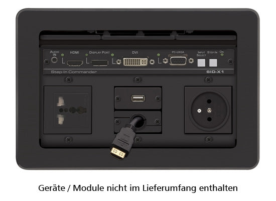 Kramer TBUS-10XL(B) Tischtank, schwarz TBUS−10xl ist das Gehäuse für ein neues modulares Tischanschluss−System mit einer manuell versenkbaren Abdeckung. Ein komplettes TBUS−System erfordert das Gehäuse, einen Einbaurahmen, Steckdose/n, Anschlussblenden und Netzkabel. Features Rechteckig Versenkbarer Deckel Modulares Design Passend für Kramer MegaTOOLs wie SID−X1N, SID−X2N, SID−X3N Technische Daten Abdeckung: Manuell öffnen und schliessen Einbaurahmen: Verschiedene "T10F" Einbaurahmen sind verfügbar. T10F-22M dient zur Aufnahme eines Kramer MegaTOOL wie z.B. SID-X1N, SID-X2N oder SID-X3N und bis zu 2 Steckdosen und 2 Moduleinsätzen. Steckdosen: 11 verschiedene "TS" Einzel- und 10 Dual-Power Steckdoseneinsätze sind verfügbar, um weltweit die verschiedenen Anschlüsse abzudecken. Netzkabel: 8 verschiedene "C-AC" Einzel-Netzkabel und 3 "Y" Netzkabel zur Stromversorgung der Steckdosen. Tiefe der Anschlussblende: Einstellbar Zubehör: TBUS-Halterungen (im Lieferumfang des TBUS Gehäuse), Sägeschablone, Schrauben, Kabelbinder Anforderungen zur Installation: Tischausschnitt 245 mm x 154 mm Abmessungen: Abdeckplatte 261 mm x 172 mm Gewicht: TBUS-10xl: ca. 1,35 kg; Tischklemmen: ca. 0,25 kg