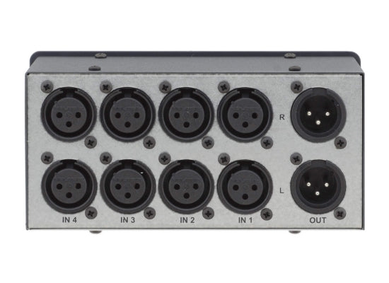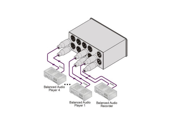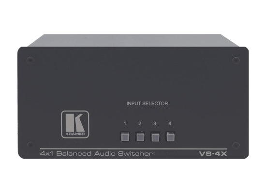Kramer VS-4X Umschalter Der Kramer VS-4X ist ein High-Performance Umschalter für symmetrische Stereoton-Signale mit XLR-Anschlüssen. Er schaltet eines von vier Stereoton-Signalen auf einen einzelnen Stereo-Ausgang. Features Mechanische (passive) Umschaltung - Keine Stromversorgung erforderlich Desktop-Größe - Kompakte Abmessungen Zwei Geräte können nebeneinander in einem 19" 2HE Rack-Space montiert werden mithilfe des optionalen RK-4X Rack-Adapters Technische Daten Eingänge: 4 Stereo-Audio symmetrisch, +4dBm typ., mit XLR-Buchsen Ausgänge: 1 Stereo-Audio symmetrisch, +4dBm typ., mit XLR-Steckern Umschaltsystem: Mechanisch, “Break-before-make” Bandbreite (-3dB): 100kHz Kreuzungspunkte: 4x 2 für Stereo-Audio Signal-Pegel: Bis zu +30dBm Optionen: 19” Rack-Adapter RK-4X (für 2 Einheiten) Abmessungen: 15,3cm x 6,6cm x 7,6cm (BxTxH) Gewicht: Ca. 0,57kg