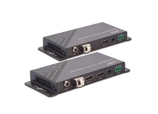 Lindy 38174 Fibre Optic HDMI IR Extender Der Lindy 300m/1000m Fibre Optic HDMI & IR Extender ist eine erstklassige Lösung, um 4K 60Hz Ultra-HD-Signale über große Distanzen zu übertragen, wie es mit traditonellen Kupferkabeln nicht möglich wäre. Verwendet wird hierzu ein Standard-Glasfaserkabel LC Simplex. Die HDMI 2.0 Spezifikation ermöglicht mit intelligenten Komprimierungsmethoden die Übertragung detaillierter 4K-Ultra-HD-Auflösungen, wobei das Signal am Receiver für optisch verlustfreie Bilder dekomprimiert wird. Durch die Unterstützung von HDR (High Dynamic Range) können Videoinhalte mit Brillianz, mehr Kontrast und einem breiteren Farbspektrum wiedergegeben werden - perfekt für auffallende Digital-Signage-Systeme im Einzelhandel, eindrucksvolle private Installationen oder für ein immersives Erleben von Sportveranstaltungen. Die HDCP 2.2 Kompatibilität ermöglicht, dass geschützter 4K-Inhalt bei Film und Fernsehen problemlos gesehen werden kann. Anders als bei kupferbasierten Systemen garantiert der Einsatz von Glasfaserkabeln auch die Immunität gegen elektromagnetische Störausstrahlung und hochfrequente, magnetische Felder und damit eine stabile Signalübertragung im lärm- und störungsintensiven Umfeld in Handel und Industrie. Der Extender kann Signale über Distanzen bis 1000m übertragen und bietet damit große Flexibilität bei der Installation. Der Transmitter kann an eine Vielzahl von HDMI-Quellgeräten angeschlossen werden, z.B. Blu-ray Player, 4K HDR Mediaplayer oder PCs, während der Receiver zusammen mit einem 4K Display oder Projektor an einem geeigneten Platz in Sichtweite aufgestellt werden kann. Er eignet sich besonders für die Übertragung von Videodaten über große Entfernungen. Die beiliegende Halterung zur Montage erlaubt eine Installation unter dem Tisch oder diskret hinter Displays. Durch die bidirektionalen IR- und RS232-Ports können Quellgeräte vom Display aus gesteuert werden - umgekehrt kann das Display aber auch vom HDMI-Quellgerät aus gesteuert werden. Alternativ erlaubt die RS232-Unterstützung die Verlängerung der Steuersignale im Rahmen einer größeren Installation. Features Überträgt HDMI 2.0 18G Signale bis 300m über ein Simplex LC-Multimode Glasfaserkabel oder bis 1000m über ein Simplex LC-Singlemode Glasfaserkabel Unterstützt Auflösungen bis 4K 60Hz Ultra HD inklusive HDR (High Dynamic Range) Bidirektionale, flexible IR- oder RS232-Steuerung HDCP 2.2 Unterstützung für maximale Kompatibilität Technische Daten Spezifikationen AV-Schnittstelle: HDMI Schnittstellen-Standard: HDMI 2.0 Unterstützte Bandbreite: 18Gbit/s Max. Reichweite: 300m (984.24ft) (Multimode 50/125µm Glasfaserkabel) 1000m (4921.2ft) (Singlemode 9/125µm Glasfaserkabel) Maximale Auflösung: 3840x2160@60Hz 4:4:4 8Bit HDCP-Unterstützung: Pass-Through EDID Pass Through: Pass-Through Audio: Pass-Through Separate Audio-Ports: 3.5mm IR-Unterstützung: 20KHz – 60KHz Serielle Schnittstelle: RS232 (bidirektional) Übertragungsmedium: 1 x Simplex LC Laserklasse (nur bei LWL): 1 Wellenlänge (nur bei LWL): 1310 und 1550nm (mit beiliegendem SFP+ Modul) Chipsatz: SD1503/SD1513 Spezielle Eigenschaften: Auto Laser, -Sperrfunktion Anschlüsse Transmitter-Eingänge: HDMI Typ A (Buchse), 3.5mm Audio (Buchse) Transmitter-Ausgänge: Simplex LC, HDMI Typ A (Buchse) Receiver-Eingänge: Simplex LC Receiver-Ausgänge: HDMI Typ A (Buchse), 3.5mm Audio (Buchse) Bidirektionale Ports: RS232 (Terminal Blocks), IR (Buchse) Stromversorgung / Netzteil: 5.5/2.1mm DC Buchse Physische Eigenschaften Gehäusematerial: Metall Betriebstemperatur: 0°C - 40°C Lagertemperatur: -20°C - 60°C Feuchtigkeit: 20 - 90% RH (nicht-kondensierend) Leistungsaufnahme: 5VDC 1A Farbe: Schwarz Maße (BxTxH): 100x65x25.6mm Gewicht: 0.516kg Lieferumfang Transmitter Receiver 2 x Multi-Country-Netzteil (EU, UK, US & AUS) 2 x SFP+ Module 2 x Terminal Blocks 2 x IR Emitter Kabel 2 x IR Receiver Kabel Lindy Handbuch