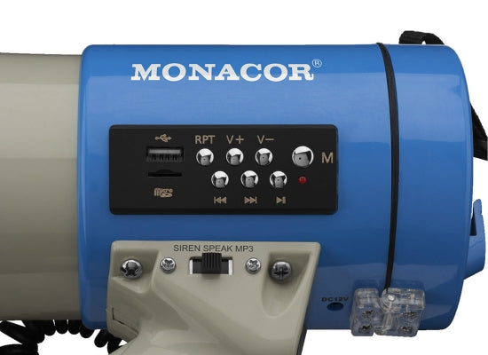 Monacor TM-17M Megaphon Features Mit MP3-Abspielfunktion Handmikrofon mit Spiralkabel Sprech-Feststelltaste, Lautstärkeregler und Aufnahme-/Wiedergabetasten am Mikrofon Aufnahmefunktion über Mikrofon (bis zu 20 Sekunden) MP3-Modul mit Abspielfunktion vom USB-Stick oder von einer Micro-SD-Karte Lautstärke von MP3 und Mikrofon getrennt regelbar Betriebsschalter für Sirene Buchse für externen 12-V-Batteriebetrieb Kfz-Anschlusskabel Technsiche Daten Hand-Mikrofon: ja Feststelltaste Mikrofon: ja Pistolengriff: ja Schultergurt: ja Kfz-Anschlusskabel: ja Sirene: ja Lautstärkeregler: ja Ausgangsleistung (PMAX): 25 W Kennschalldruck: 110 dB Stromversorgung: 8 x 1,5-V-Baby-Batterie (C) 2-V-Anschluss: ja Maße: Ø 230 mm x 340 mm Gewicht: 1,3 kg