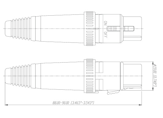 Neutrik NC3FXS XLR 3pol Stecker Technische Daten Material: ZnAl4Cu1 Max. Stromstärke: 16 A Max. Spannung: 1500 V Ausführung: 3-pol, weiblich, gerade mit Schalter Temperaturbereich: -30° bis +80° C Länge: 90 mm Durchmesser: 22,6 mm