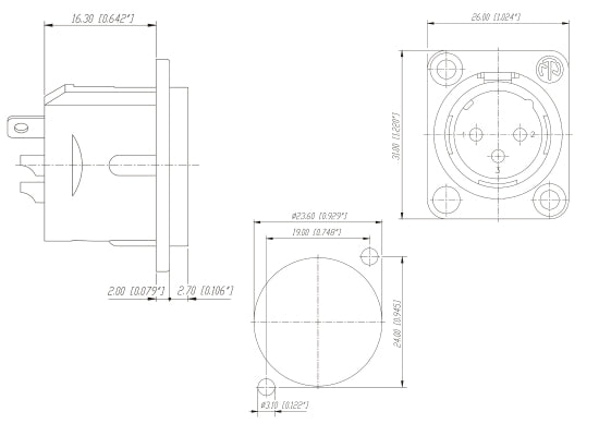 Neutrik NC3MDL1 XLR 3pol Einbaubuchse Technische Daten Material: ZnAl4Cu1 Max. Stromstärke: 6 A Max. Spannung: 250 V Ausführung: 3-pol, männlich, qudratisch Temperaturbereich: -30° bis +80° C Maße (B x H x T): 26 x 31 x 21,7 mm