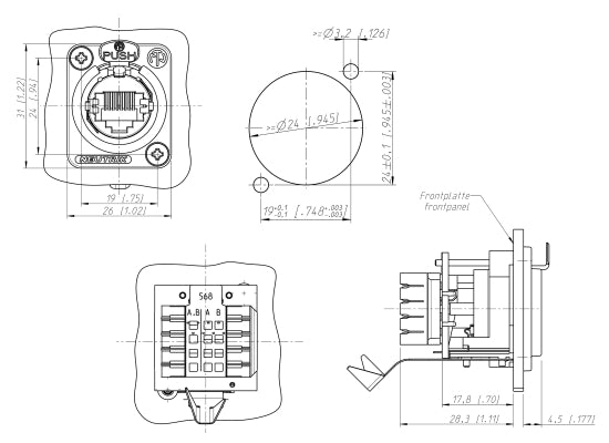 Neutrik NE8FDVYKB RJ45 Chassisbuchse RJ45 Chassisbuchse in schwarz verchromtem D-Gehäuse, Schneid-Klemmtechnik-Anschluss, max. Frontplatten stärke 4 mm. Montageschrauben inklusive. Die etherCON Serie ist ein robustes und verriegelbares RJ45 Steckersystem, das für ProAudio-, Video- und Licht-Netzwerkapplikationen konzipiert ist. Die Einbaubuchsen sind so geformt, dass sie in standardisierte Entertainment-Industrie-Panels passen. Die robuste D-Serie ist hervorragend für Panel Montage und Installateure geeignet. Achtung! Nicht kompatibel mit dem CAT6 Kabelstecker NE8MC6-MO und den Kabeln NKE6S*. Features Passend für NE8MC-B sowie alle Standard RJ45 Stecker Bewährtes Push-Verriegelungssystem Kann von vorne oder hinten montiert werden Entspricht Cat 5e gemäss TIA / EIA 568B und ISO / IEC 11801 Standard Wählbare Erdungsoptionen Schnelle und einfache Montage durch Krone Schneid-Klemm-Kontakt Technische Daten Verbindungstyp: RJ45 Geschlecht: female Durchgangswiderstand: < 10 mΩ Durchschlagsfestigkeit: 1 kVdc Frequenzbereich: 1 - 100 MHz Isolationswiderstand: > 0.5 GΩ Nennstrom pro Kontakt: 1,5 A Nennspannung: 50 V Übertragungsleistung: CAT 5e Normen Kompatibilität: TIA / EIA 568B and ISO / IEC 11801 Einsteckkraft: ≤ 20 N Aussteckkraft: ≤ 20 N Lebensdauer: > 1000 mating cycles Frontplattenstärke: max. 4 mm 0.16, , Leiterquerschnitt: 0.14 - 0.5 mm² Leiterquerschnitt: 26 - 20 AWG Anschlussart: IDC punch down terminals (2 mounting screws included) Verriegelung: latch lock Einbaurichtung: front & rear Gehäuseform: D Kontaktbeschichtung: 0.2 µm Au over Ni plating Kontakte Bronze: (CuSn8) Einsatz: PBTP 15 % GR Gehäuse: Zinc diecast (ZnAl4Cu1) Gehäusebeschichtung: Black chromium Zugentlastung: CuZn35Pb2, Tin plated Normenkompatibilität: CAT5e, Class D acc. TIA/EIA 586B, IEC11801, EN 50173 Temperaturbereich: -30 °C to +80 °C