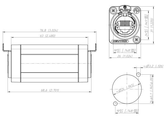 Neutrik NE8FF Netzwerkverbinder RJ45 Durchgangskupplung für Kabelverlängerungen Die etherCON Serie ist ein robustes und verriegelbares RJ45 Steckersystem, das für ProAudio, Video- und Licht-Netzwerkapplikationen konzipiert ist. Die Einbaubuchsen der Neutrik NE8FF sind so geformt, dass sie in standardisierte Entertainment Industrie Panels passen. Die robuste D-Serie ist hervorragend für Panel Montage und Installateure geeignet. Features Passend für NE8MC sowie alle Standard RJ45 Stecker Bewährtes Push-Verriegelungssystem Technische Daten Verbindungstyp Adapter Geschlecht female Durchgangswiderstand < 10 mΩ Durchschlagsfestigkeit 1 kVdc Frequenzbereich 1 - 100 MHz Isolationswiderstand > 0.5 GΩ Nennstrom pro Kontakt 1,5 A Nennspannung 50 V Standard compliance TIA/EIA 586B, IEC11801 Einsteckkraft ≤ 20 N Aussteckkraft ≤ 20 N Lebensdauer > 1000 mating cycles Verriegelung latch lock Kontaktbeschichtung 0.2 µm Au over Ni plating Kontakte Bronze (CuSn8) Einsatz PBTP 15 % GR Gehäuse AlMgSi 0.5, black plated Gehäusebeschichtung Black painted Zugentlastung CuZn35Pb2, Tin plated Entflammbarkeit UL 94 HB Temperaturbereich -30 °C to +80 °C