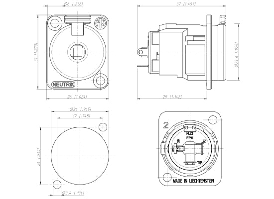 Neutrik NJ3FP6C-BAG Profi Klinkenbuchse zum Einbau, stereo Technische Daten Typ Stereoklinkenbuchse: 6,3 mm Farbe: schwarz Temperaturbereich: -20° bis +65° C Maße (BxHxT): 26x31x36mm