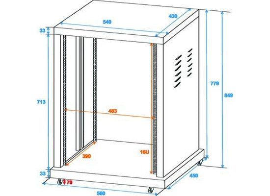 Omnitronic SR-19 Stahl Rack 16 HE Features Schwarze pulverbeschichtete Oberfläche Gestanzte Rackschienen vorne und hinten 4 Lenkrollen, Integrierte Stützschiene in den Seitenteilen für schwere Geräte wie Endstufen Käfigmuttern, Schrauben und Plastikscheiben sind im Lieferumfang enthalten Einbautiefe 41 cm Lieferung erfolgt zerlegt In verschiedenen Höheneinheiten erhältlich (1 HE = 44 mm) Technische Daten Maximalbelastung: 100 kg Außenmaße (BxTxH): 560 x 450 x 840 mm Gewicht: 20 kg