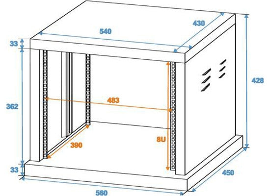 Omnitronic SR-19 Stahl Rack 8HE Features Schwarze pulverbeschichtete Oberfläche Gestanzte Rackschienen vorne und hinten Integrierte Stützschiene in den Seitenteilen für schwere Geräte wie Endstufen Käfigmuttern, Schrauben und Plastikscheiben sind im Lieferumfang enthalten Einbautiefe 41 cm Lieferung erfolgt zerlegt Technische Daten Maximalbelastung: 50kg Außenmaße (BxTxH): 560x450x450mm Gewicht: 11kg