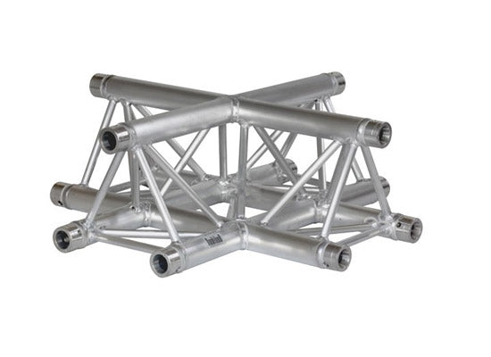 Prolyte H30D C016 Kreuz Traversen der Serie H30 bestehen aus Hauptrohren (48,3 x 3 mm) und Diagonalen (16 x 2 mm). Ausgestattet mit dem Konusverbindersystem CCS6, lässt sich die Traverse H30 schnell und bequem montieren. Traversen der Serie H30 werden unter anderem im weltweiten Verleihgeschäft eingesetzt, wo ihr die optimale Stabilität und Flexibilität zu einer großen Beliebtheit verhilft. Die Traverse der Serie H30 ist als Dreieck- und Viereckausführung lieferbar und umfasst verschiedene Eckenformen und Zubehör. Technische Daten Lieferung OHNE KONUSVERBINDER! Kreuz, 4-Weg, 0.71x0.71m 3-Punkt-Fachwerk Außenmaß: 287 mm Anschlüsse über Koniverbinder CCS6 Schenkellänge: 710mm Gewicht: 7,17kg