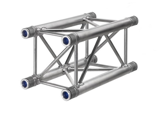 Prolyte H30V Verto Traverse, 0.29m Die Verto Traversen basieren auf einem neuen Prinzip der Traversenverbindung, bei dem die Abschnitte durch ein Drehkupplersystem verbunden sind. Dieses System hat, gegenüber den bereits bestehenden Systemen, einige Vorteile. Der Name Verto stammt aus dem Lateinischen, es bedeutet drehen oder umdrehen. Genauso funktioniert auch die Montage. Die Verto Traverse ist konzipiert für eine leise und schnelle Montage. Ein durchschnittlicher Schallpegel von konischen Traversen beträgt normal circa 80dB. Dieses System hat einen geprüften Schallpegel von 55dB. Darüber hinaus ist die Montagezeit bis zu 3x schneller gegenüber konischen Traversen und bis zu 7x schneller gegenüber jeglicher Schraubverbindungen. Features Werkzeugloses System - Es wird kein Werkzeug für die Montage oder Demonatage benötigt Keine abstehenden Teile - Eigenet sich ideal zum Anbringend von Bannern oder Vorhängen Schnelle Montage - Verbindung durch einfache Umdrehung des Couplers Stark und kompakt - Basierend auf dem H30V System mit ähnlicher Belastbarkeit Technische Daten Lieferung OHNE KONUSVERBINDER! 4-Punkt-Fachwerk Außenmaß: 290 mm Maße: 290x290x290mm Gewicht: 2,7kg