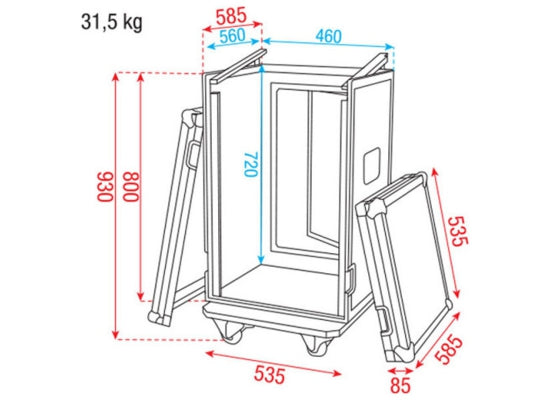Rack 16 HE gewinkelt, 16/10HE, schwarz Features schwarz geringes Gewicht Stapelbar Butterfly Verschlüsse Kugelecken austellbare Rackschienen 2 Klappgriffe Winkelrack 4x 150mm Rollen Technische Daten Maße (BxTxH): 535x585x800mm Gewicht: 31,5 kg