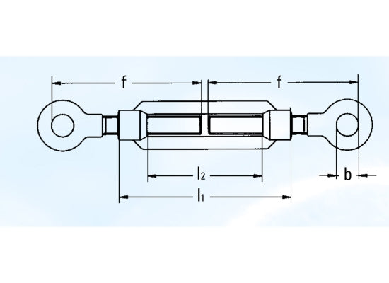 Safetex SOO-US-LANG-1/2-12 Spannschloss Technische Daten Tragkraft SF5 (WLL): 1000kg Tragkraft SF12 (BGV C1): 416kg Öse / Öse Spannweg: 304mm feuerverzinkt l1: 342mm l2: 304mm a: 36mm b: 18mm f: 228mm Gewicht: 1kg