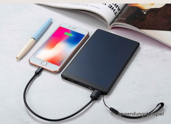 Sandberg 420-54 Urban Solar Powerbank 10000 Mit der Sandberg Urban Solar Powerbank 10000 kannst du dein Smartphone bis zu 4 Mal laden. Die Powerbank ist mit einem effizienten Solarmodul aus den USA ausgestattet. An einem sonnigen Tag produziert diese Powerbank ausreichend Strom für eine zusätzliche Ladung deines Smartphones. Perfekt für einen Tag am Strand, auf einer Sonnenterrasse oder auch bei einem Cocktail an der Bar. Das formschöne, schlanke Metallgehäuses verleiht der Powerbank einen Hauch von Exklusivität. Um einen schnellen Ladevorgang zu ermöglichen verfügt die Powerbank über 2 USB-A-Anschlüsse sowie einen weiteren USB-C PD 18W-Anschluss. Features Aufladen durch Sonnenlicht Lädt USB- und USB-C-Geräte Technische Daten Kapazität: 10.000 mAh Eingang: 1x Micro USB Ein-/Ausgang: 1x USB-C Ausgänge: 2x USB-A QuickCharge Version: 3.0 Solarpanel: 5V/450mA Micro-USB-Eingangsleistung: 5V/2A, 9V/2A, 12V/1,5A USB-C PD 18W Eingangs-/Ausgangsleistung: 5V/2A, 9V/2A, 12V/1.5A USB QC 3.0 Ausgangsleistung: 5V/3A, 9V/2A, 12V/1,5A Maße (BxTxH): 215 x 110 x 30 mm Gewicht: 0,3 kg Lieferumfang 1x Sandberg Urban Solar Powerbank 10000 1x Micro USB Kabel, 30cm 1x USB-C Kabel, 30cm