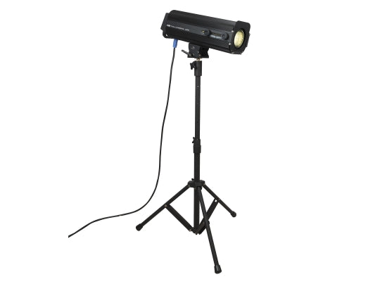 Showtec Followspot LED 120 Verfolger, kaltweiß Der Showtec Followspot LED 120W ist eine leistungsstarke Beleuchtungsvorrichtung, die für eine Vielzahl von Events und Anwendungen geeignet ist. Von Live-Band bis zum Schultheater fügt dieser Followspot genau die professionelle Note hinzu, die Sie suchen. Obwohl außerst kompakt, ist diese Leuchte mit großartigen Features ausgestattet. Dimmer, Iris und Shutter werden über 3 einzelne Fader gesteuert und verschiedene Farben können über Direktzugriffstasten ausgewählt werden. Das eingebaute Farbrad bietet Ihnen CTC-Farben (2800K, 4500K, 5400K und 6500K) und der zusätzliche Filterrahmen (enthalten im Lieferumfang) ermöglicht es Ihnen, beliebiges Farbgel an dem Spot hinzu zu fügen. Der Followspot LED 120W wird komplett mit einem soliden Stativständer geliefert. Features Kaltweiße 120-W-LED Integrierte CTC-Farben 0-100% natürlicher Dimmer einschließlich Ständer Technische Daten Ausgabeleistung Lumen: 4000+ Lux@ 3 m: 27500 (8°) LED-Anzahl: 1x CW (120 W, 10000 K) Aktualisierungsrate: 4000 Hz Dimmer: 0-100% Stroboskop: 0-20 Hz Farben: 4 + offen Iris: 2-100% manuell Strahlungswinkel: 8° - 15° Steuerung Enthalten: 3 Regler Dimmer, Iris, Shutter Optionen: Manuell Elektrik Eingangsspannung: 100-240 VAC, 50/60 Hz Leistungsaufnahme: 185 W max. @FO Physisch Gewicht Dreibeinständer: 3,4 kg IP-Schutzart: IP-20 Gehäuse: Stahl, pulverbeschichtet Anschlüsse: Pro Power Anschluss blau Kühlung Zwangskühlung (Ventilator) Maße (BxTxH): 550x250x230mm Gewicht: 5,5kg