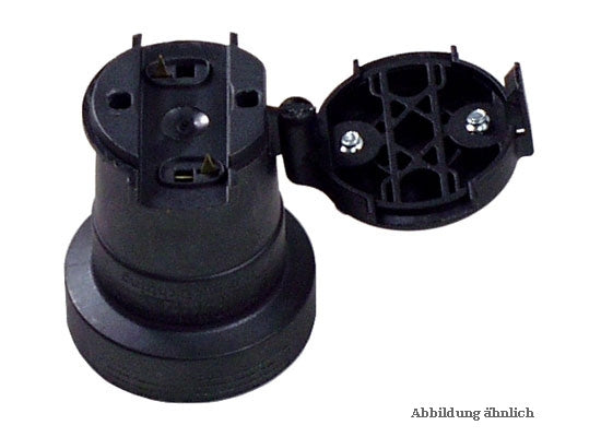 Sweetlight Illuminations-Fassung E27 für Lichterkette Features Illuminationsfassung E27 mit Messerkontakten und Schutzdeckel für Flachkabel 5x13mm Der Deckel ist mit der Fassung unverlierbar verbunden Technische Daten Farbe: schwarz Material: Kunststoff PET Schutzklasse: 2 Fassung: E27 Leuchtmittel: max. 40W Maße (D x H): 38 x 51mm Gewicht: 23g