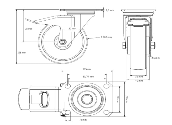 SweetPro LR-100 SW-G Lenkrolle (Black Wheel) Technische Daten Gehäuse Gehäuse-Lenkrolle mit Totalfeststeller Baureihe: Premium Befestigungsart: Befestigungsplatte Lochmaße / Nabenbreite: 80 x 60 mm / 42 mm Stärke der Befestigung: Gabel 3,00 mm / 2,50 mm Oberflächenbehandlung: galvanisch blau verzinkt Rolle Durchmesser: 100 mm Radkörper: Polyamid schwarz Radlauffläche: elastisch 70-75° Shore A black Lagerung: DIN EN 12532 Fadenschutz: kein seperater Fadenschutz Nabenbreite: 40mm Achsdurchmesser: M 8 Temperaturbereich: -20°C - +60°C dyn. Tragfähigkeit: 200 kg Prüfnorm: DIN EN 12532 Gewicht: 1,046kg