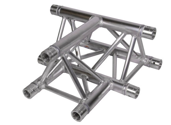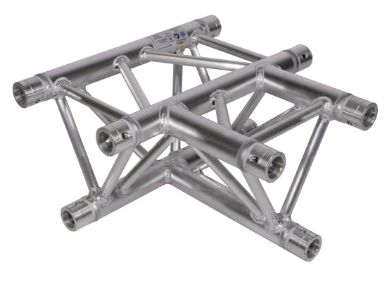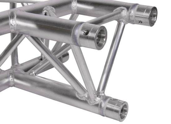 Sweettruss KV3/290-T36 T-Stück Eurotruss und Global Truss kompatibel Sweettruss KV3/290-T 3-Punkt T-Stück, gefertigt aus 50 x 2 mm Tragrohr und 20 x 2 mm Füllstäben. Das 3-Punkt Aluminium-T-Stück findet aufgrund seiner leichten und optisch ansprechenden Bauweise Verwendung auf kleinen Bühnen, sowie im Werbe- und Architekturbereich. Das T-Stück wird über konische Verbindungselemente und Kegelstifte mit den Traversen verbunden. Sonderkonstruktionen sind in fast allen Abmessungen und Ausführungen lieferbar. Technische Daten Lieferung inkl. einem Verbindersatz! T-Stück, 3-Weg, STANDARD, 0.5m 3-Punkt-Fachwerk Systemmaß = 240 mm Außenmaß = 290 mm Anschlüsse über Koniverbinder mit Kegelsteckern Legierung AlMgSi 1 F28 (Al 6082t6) Schenkellänge: 500mm Packmaß: 500x500x257mm Gewicht: 4,6kg