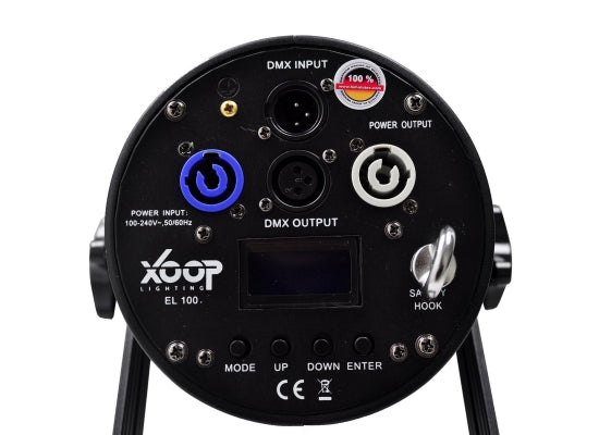 XOOP EL100 LED Spot Technische Daten Lichtquelle: 200W COB LED Farbtemperatur: 3200K - 5600K (per DMX oder Display schaltbar) Abstrahlwinkel: 22° (innen), 45° (außen) Steuerung: DMX512 (2/3/4) Gehäusefarbe: schwarz Zubehör: Torblende optional Maße (BxHxT): 450x240x180 mm Gewicht: 4,25 kg